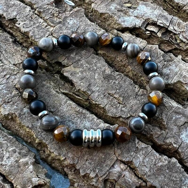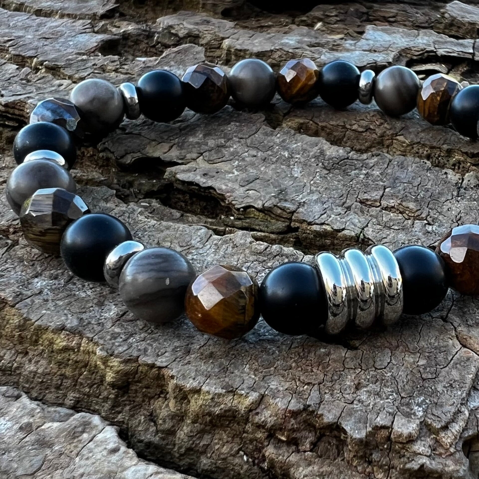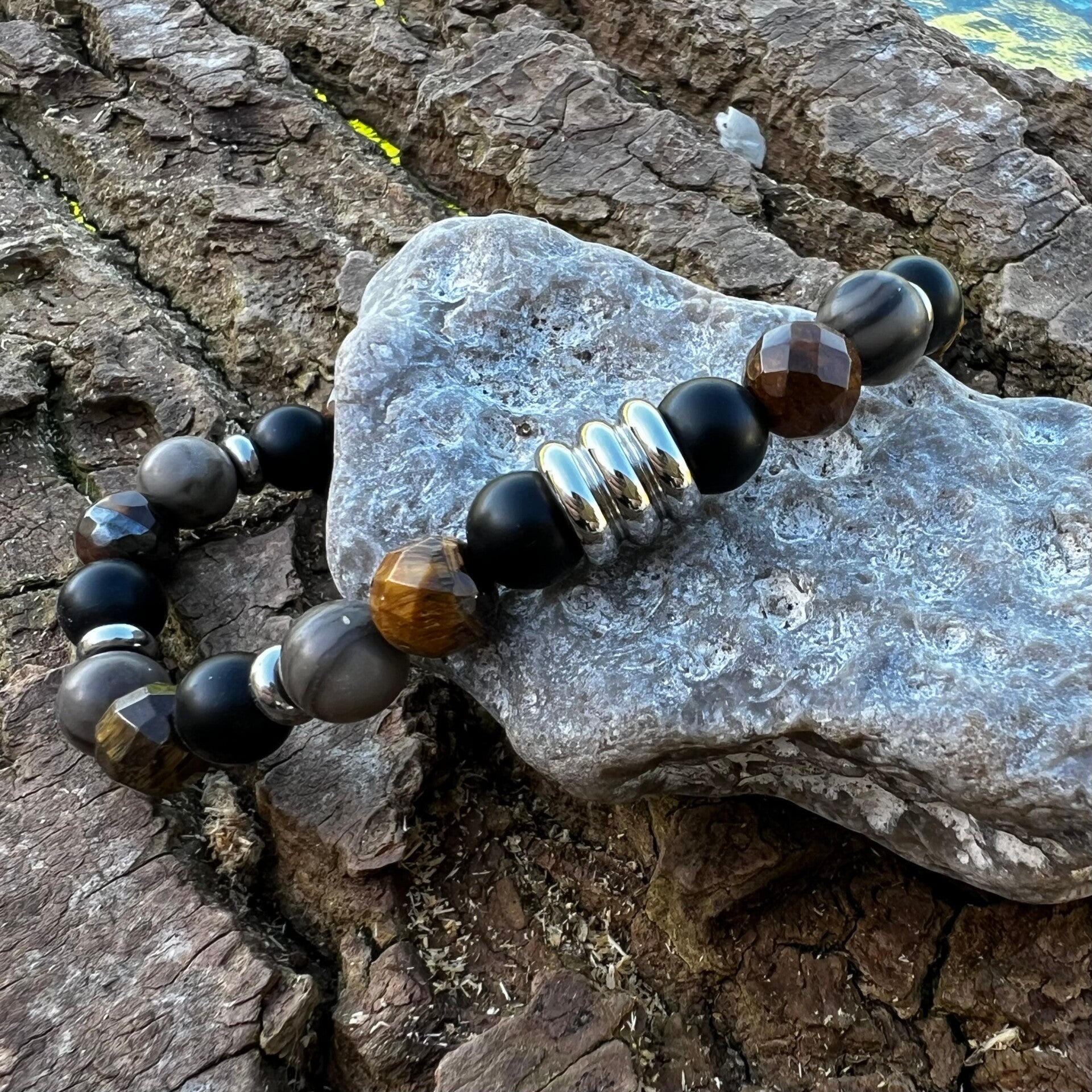 Armbåndet er opbygget af facetslebet Tigerøje, der fanger lyset i alle vinkler, og dybsort Agat. De organiske perler af fossilt træ tilfører en rustik varme, som brydes af rå stålskiver og en markant stålperle i midten, der fuldender det industrielle look. Monteret på kraftig smykkeelastik.
