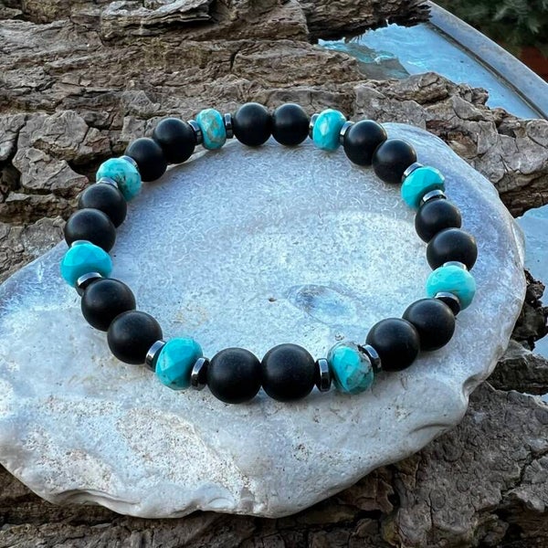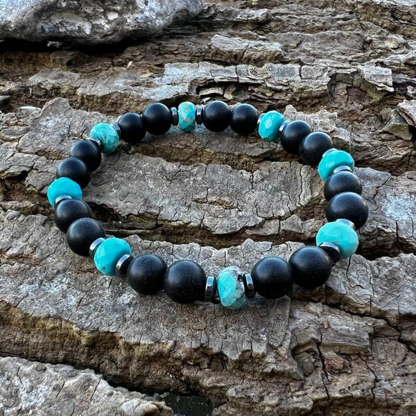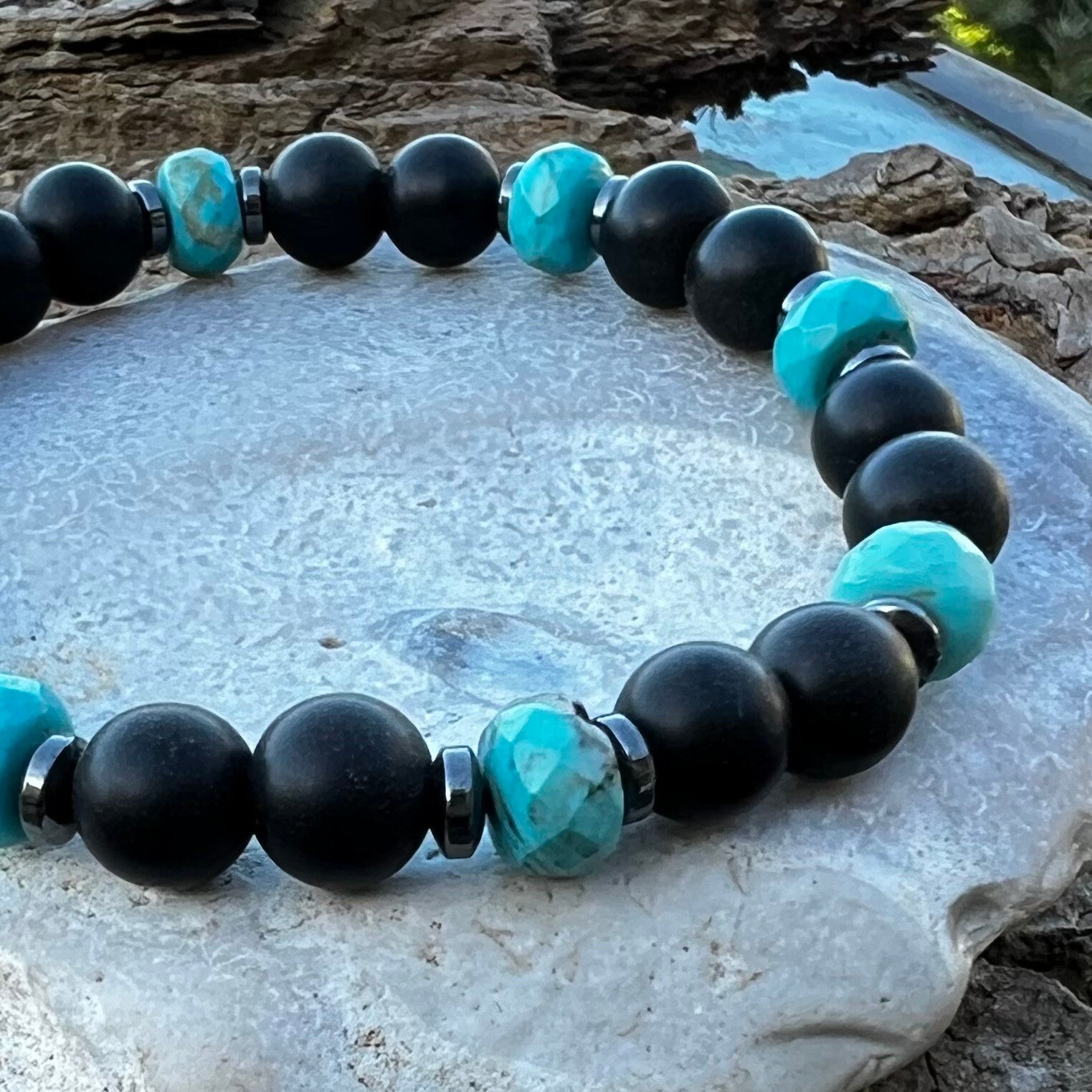 Designet består af 8 mm sorte Agat-perler og facetslebne rondeller af turkisfarvet Magnesit, der fanger lyset og giver armbåndet liv. Mellem stenene er der indsat kølige Hæmatit-skiver, som med deres metalliske glans binder de forskellige materialer sammen til en harmonisk helhed. Monteret på kraftig smykkeelastik.