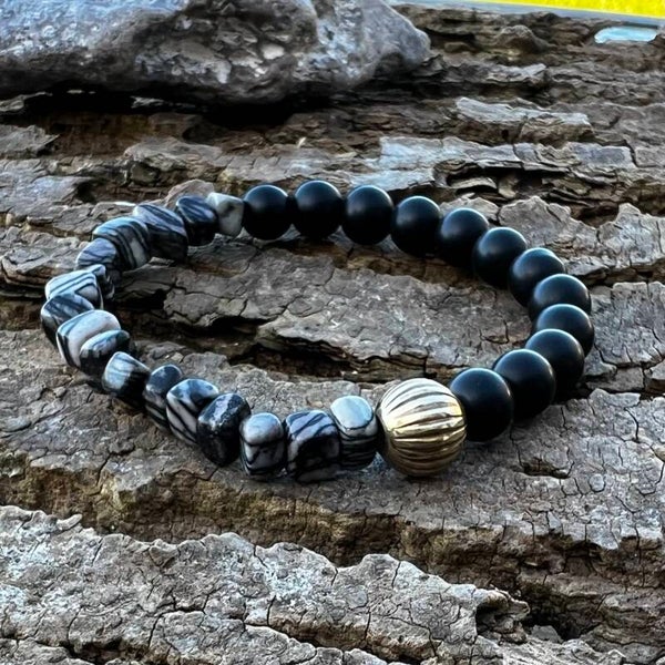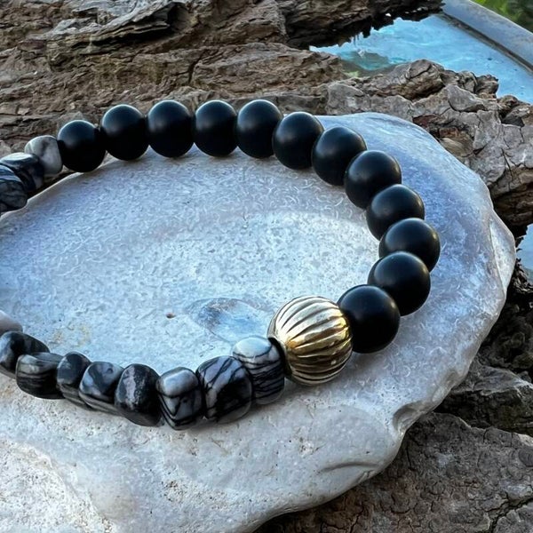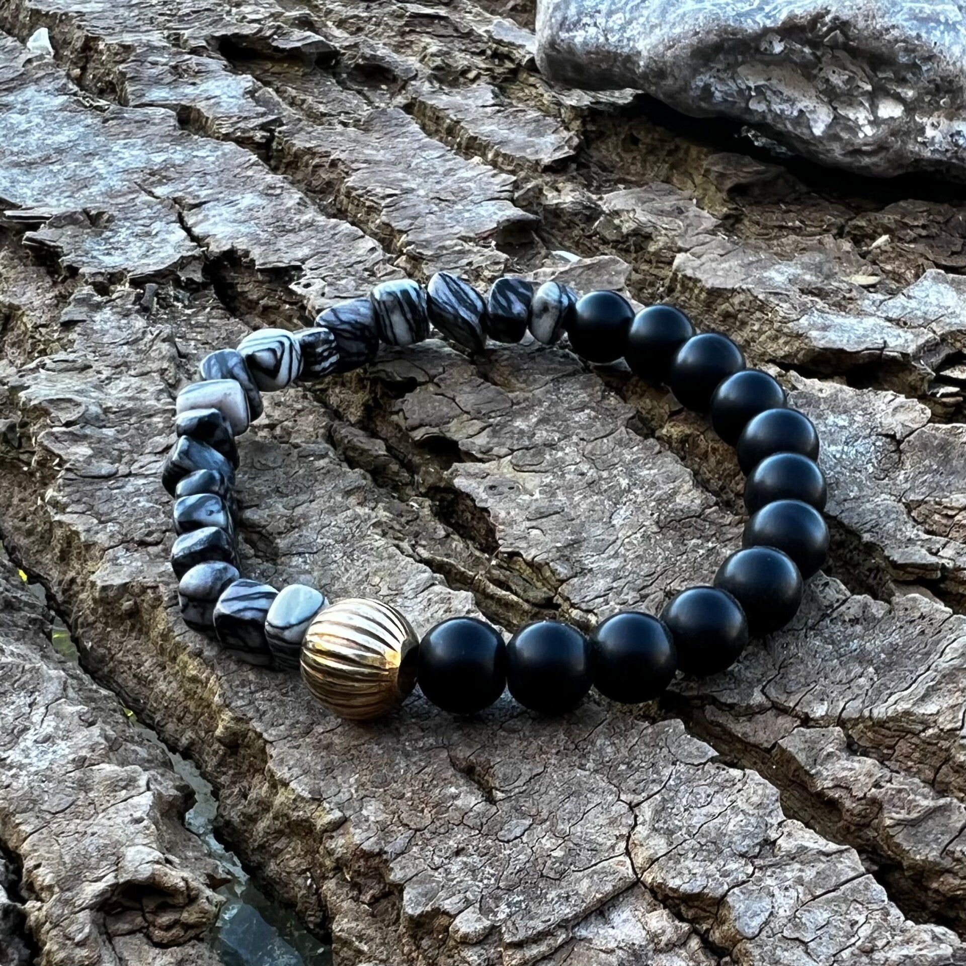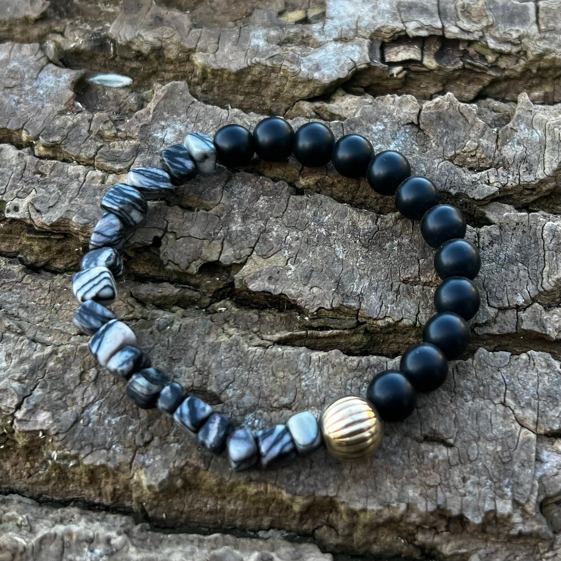 Armbåndet er delt op i to halvdele: Den ene side består af karakterfulde nuggets i sort og gråstribet Båndagat, mens den anden side er rolig og stilren med 8 mm sorte Agat-perler. I centrum sidder en stor, rillet perle i forgyldt 925 sterlingsølv, der lyser op og binder de mørke sten sammen. Monteret på kraftig smykkeelastik.