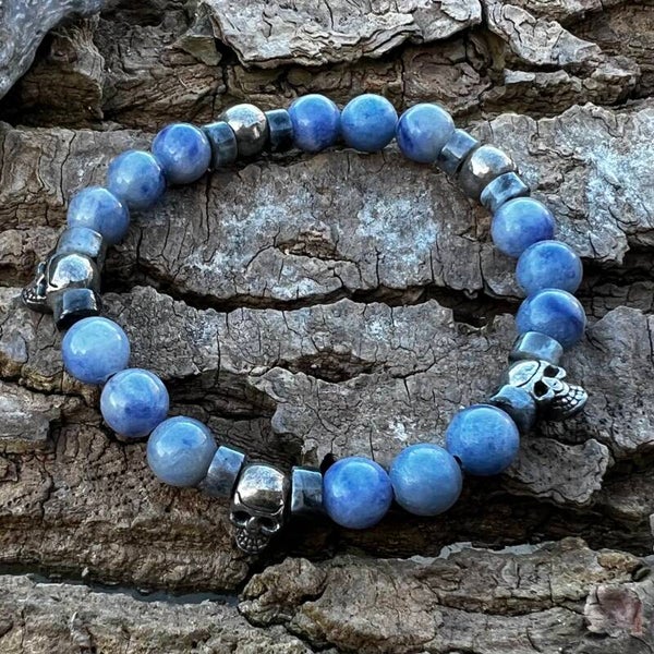 Designet er bygget op omkring 8 mm himmelblå perler med et naturligt farvespil, der brydes af mørke Labradorit-rondeller. Labradoritten tilføjer et mystisk, changerende glimt, mens stålkranierne giver armbåndet tyngde og karakter. Monteret på kraftig smykkeelastik.