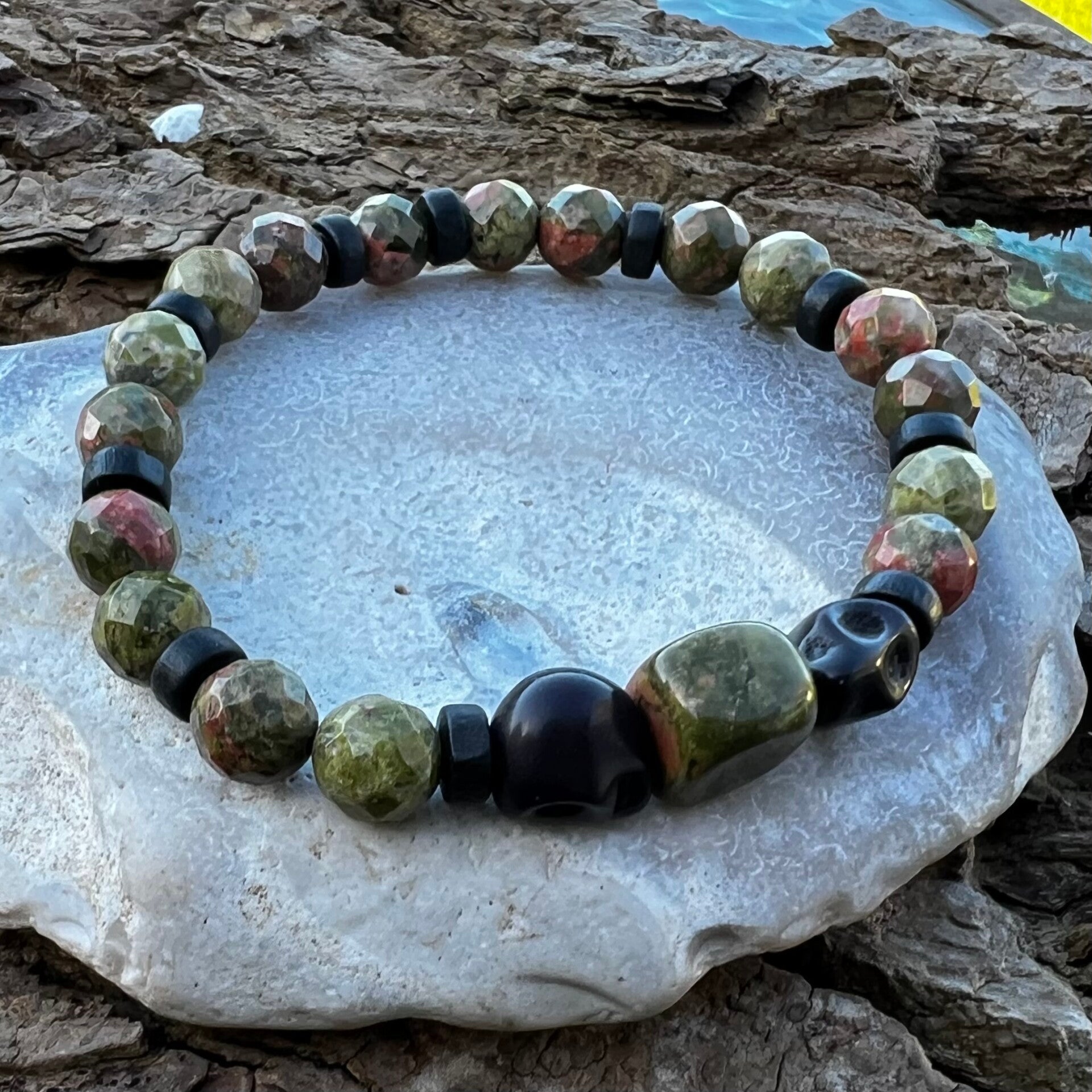Armbåndet er bygget op omkring en stor, næsten kvadratisk Unakit-nugget (ca. 15x12 mm), der fungerer som et massivt midtpunkt. På hver side flankeres den af sorte kranier og facetslebne 8 mm Unakit-perler, som brydes af sorte kokos-rondeller for at give tekstur og dybde. Monteret på kraftig smykkeelastik.