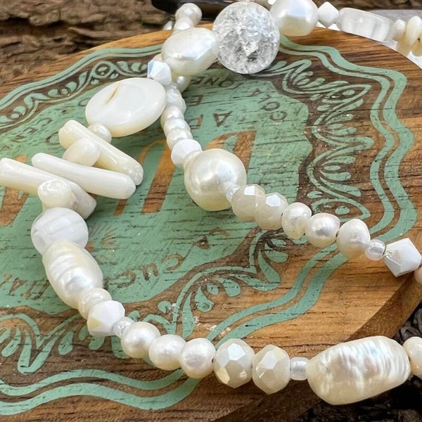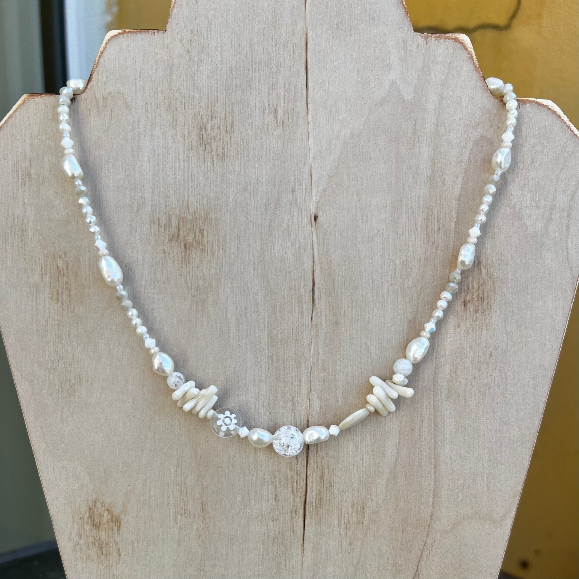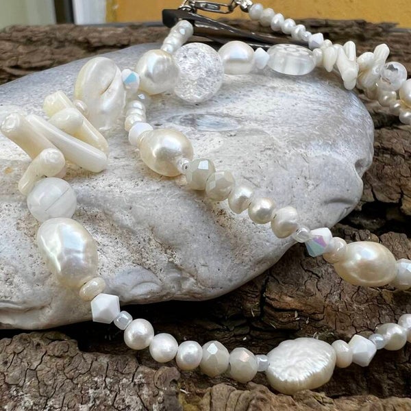 Kæden veksler mellem fine 3-4 mm ferskvandsperler og større, organiske perler. I fronten samles blikket om en klar Bjergkrystal, en glasmønt med blomstermotiv og fine koral-kviste. Små Swarovski-krystaller og Czech-perler tilfører et diskret glimmer, der minder om solens genskin i vandkanten.