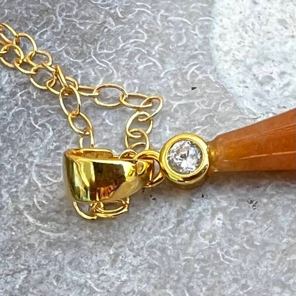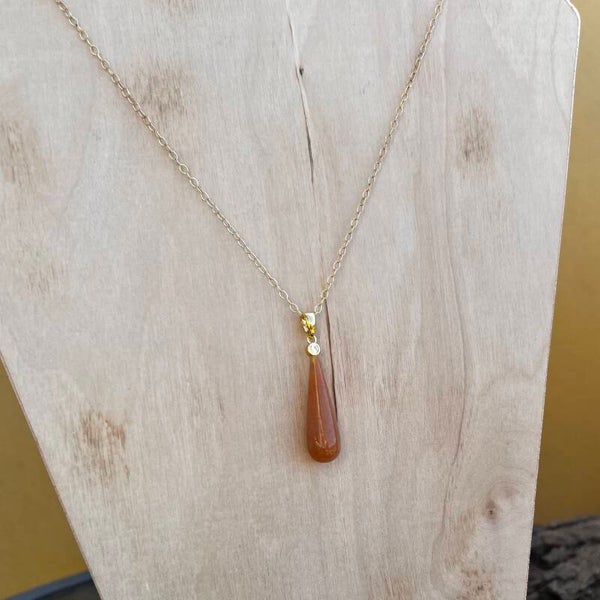 Halskæden er udført i forgyldt sterlingsølv og prydet med en klar zirkon i en fin fatning. Heraf hænger en stor, markant dråbeformet Goldsand Sunstone (ca. 3,5 cm), der med sin varme farve og diskrete, indre dybde giver smykket en luksuriøs karakter. Det er et smykke til dig, der søger elegance med et roligt, men kraftfuldt udtryk.