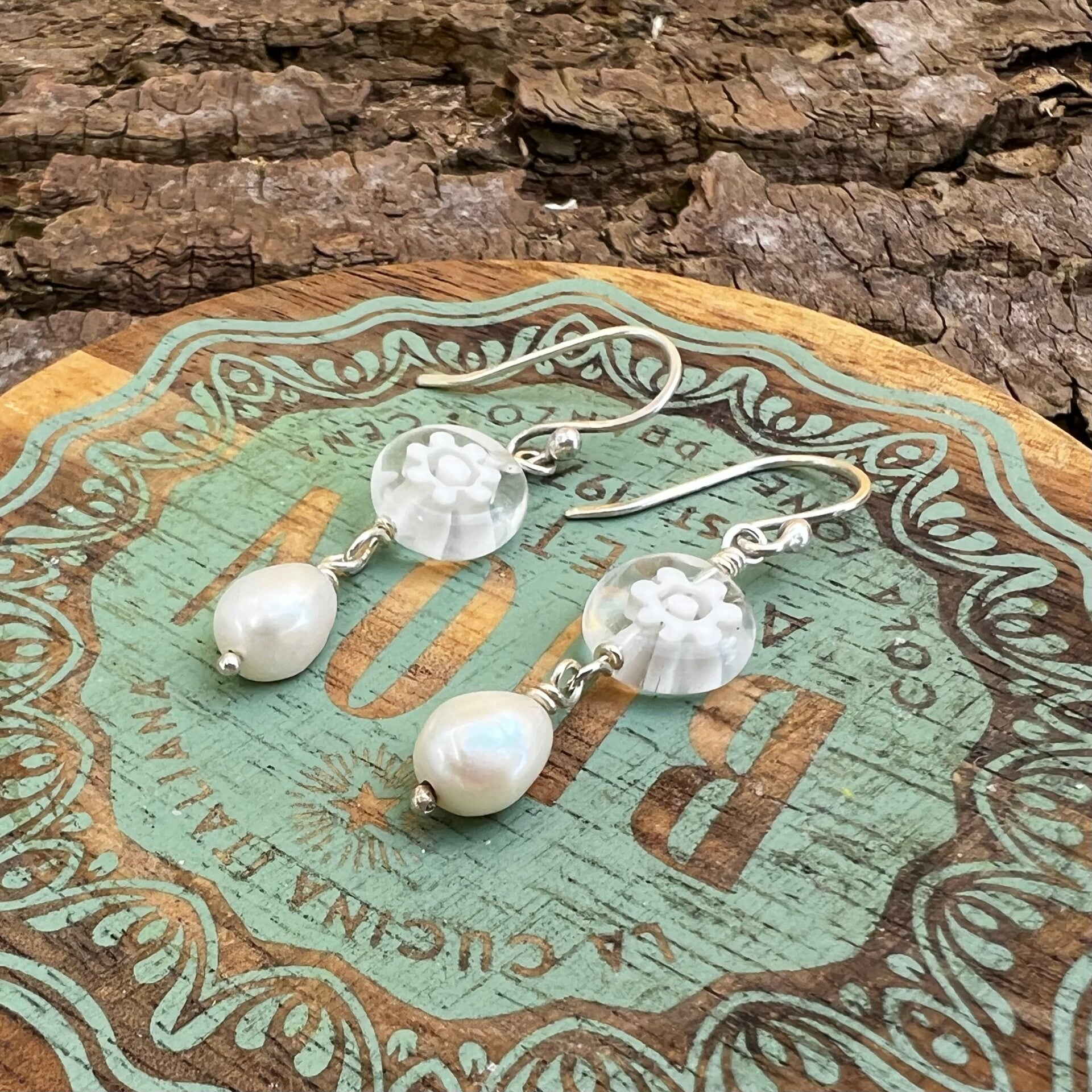 Øreringene er opbygget med en smuk, hvid glasmønt, der er prydet med et fint blomstermotiv. Herunder hænger en organisk, ujævn ferskvandsperle, der med sin naturlige form giver smykket et autentisk og levende udtryk. Monteret på klassiske ørekroge for et let og luftigt fald.